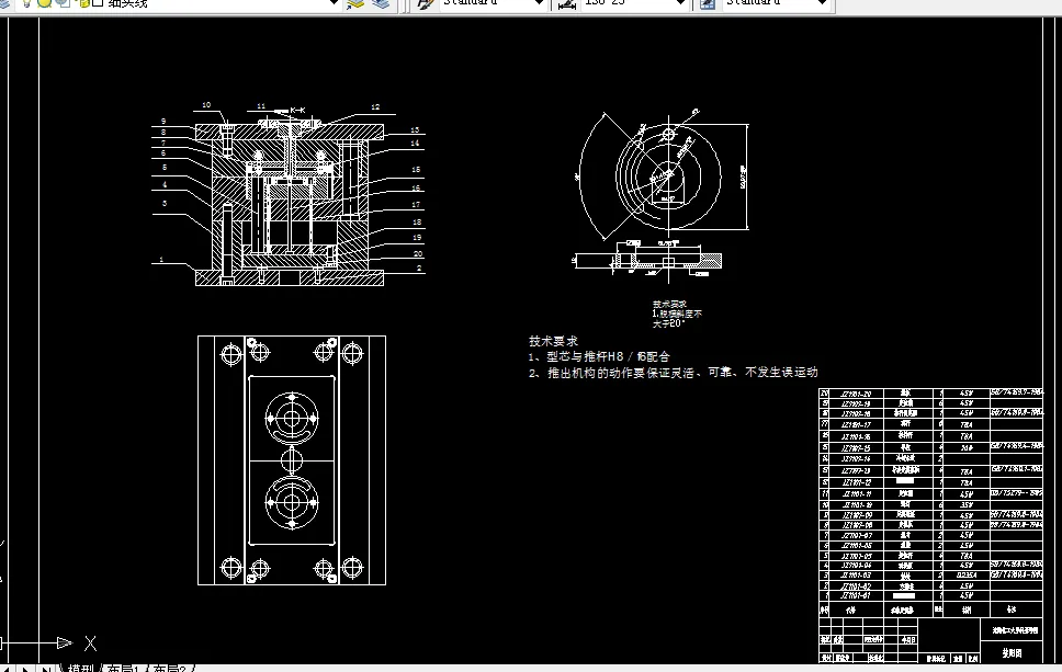 汽车座椅弯曲模设计,包括装配图,3张非标零件图。 由工件图可知,该工件的加工涉及到落料、冲孔、弯曲三种工序内容。根据工序结合,选择合理方案。 方案一:分别由三套单工序模具来进行生产; 方案二:由一套级进模来完成两个工序; 方案三:由一套复合模完成落料冲孔,U形弯曲部分直接由弯曲模完成; 由于是中批量生产,且单工序模具成本低,生产难度小,且能保证冲裁件的弯曲尺寸和平整性,生产效率高,故选择方案三。