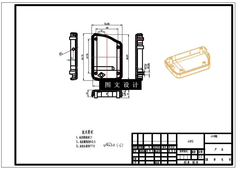 该产品形状如中规中矩型零件,精度及表面粗糙度要求较高,不允许有明显的熔接痕、飞边等工艺痕迹,需要一定的配合精度要求。制品整体有充分的脱模斜度,各处脱模力比较合理。从整体结构分析:制品表面积较大、高度不大但是壁薄、零件的曲面复杂,型腔、型芯加工困难。从整体工艺性分析:根据制品外观要求与结构特定要求选择侧浇口,制品薄而大要求冷却必须均匀而充分,脱模力合理要求顶出机构顶出均匀。