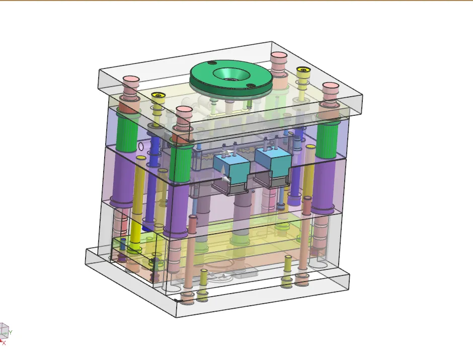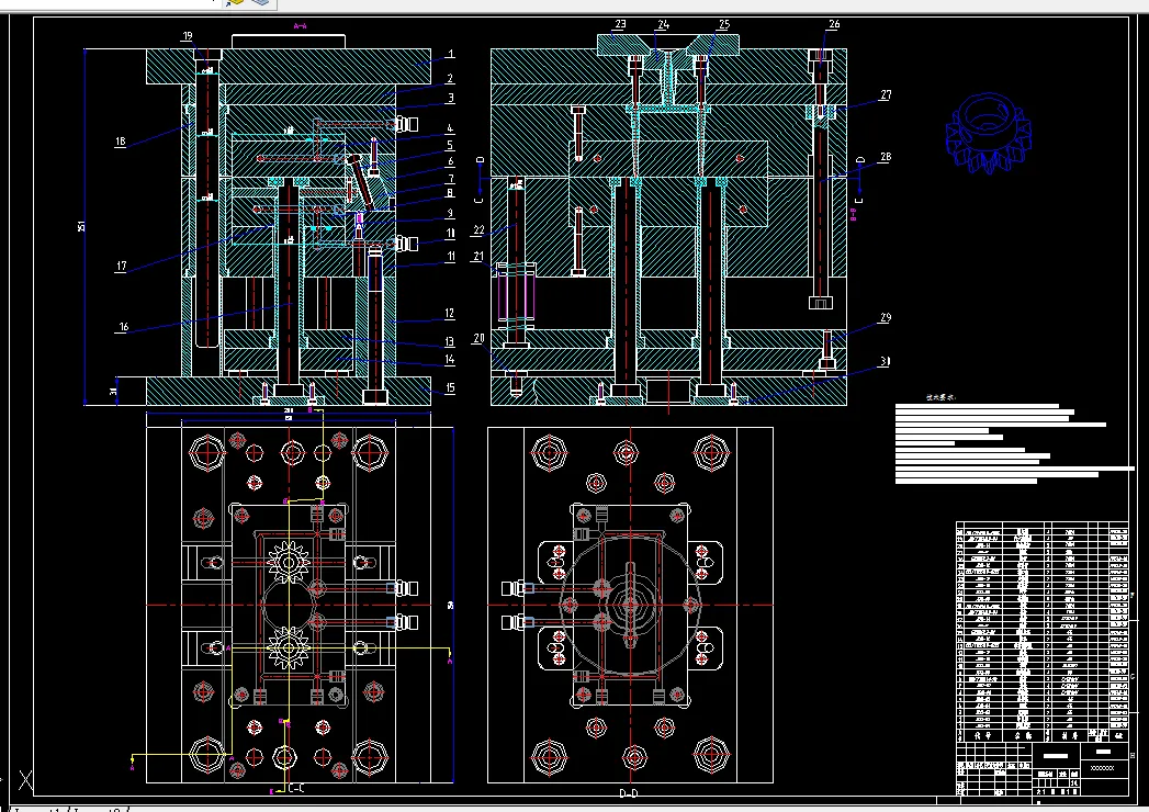 本次课题设计的目标是通过对齿轮塑件的成型特点和要点进行分析,设计一副注塑模具,从而实现齿轮的大批量自动化生产。齿轮是汽车中使用的一种线束,其结构比较复杂,上面分布着较多齿头,产品呈不规则结构,产品表面质量要求一般,产品内部有较多卡扣进行装配。该塑件产品应无毛刺、裂纹、气泡、过热变形等现象。针对齿轮的模具设计,齿轮的材料决定采用POM。在模具设计时考虑了减少浇注系统对流体的阻力,采用圆锥形的主流道,便于拉出余料,利于生产。在模具设计时针对型腔布置、模具的成型主要部件、塑件推出方式、标准件选用、设计合理的加热冷却系统、浇注与排气系统、注塑机的选择以及相关参数的校核都有着较详细的计算过程。设计中主要运用CAD软件对齿轮的三维模型与模具的装配图与零件图进行绘制。最终,设计出了一副结构较简单、安全、可靠和实用的注塑模具。该设计保证了产品的质量,能够满足大批量生产的要求。