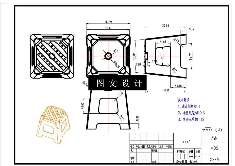 在对塑料凳子的模具设计过程中,本设计主要设计要点如下:塑件的设计比较的合理;分型面的选择有利于塑件成型;脱模机构的设计不但结构简单,而且脱模动作稳定可靠;进浇口的选择不影响塑件外观,而且保证塑件充填均匀;冷却水道的设计使模具效率达到最高,保证塑件质量要求;在设计的过程中借用分析软件如CAD等使设计更合理、更有效;大量使用标准件,使模具制作成本大大降低;本模具设计最关键的一点就是设计已达到实际生产的要求。