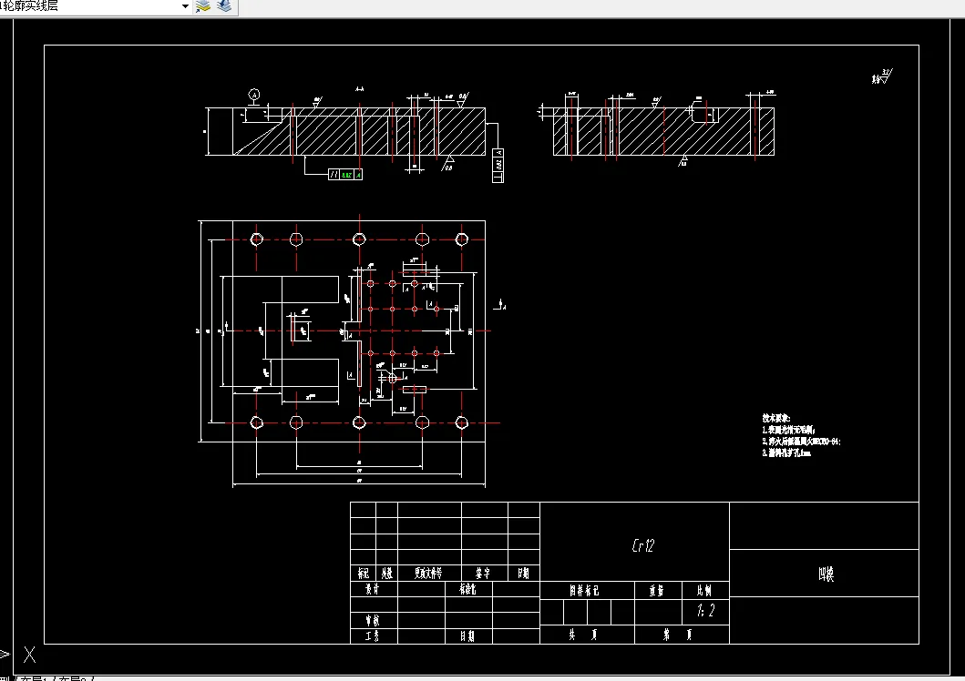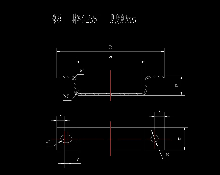 本次设计的题目是弯板级进模模具设计,首先我们需要对弯板进行详细的分析,分析一般包含三个方面,分布是材料分析,结构分析和工序分析。该工件弯板材料为Q235钢,属于常用的钣金类材料,冲压性能比较好,结构上总体来说结构基本属于对称,厚度是1mm,其中弯板是一个落料冲孔弯曲的弯曲件。外形靠落料完成,冲孔靠冲孔完成。最后还有弯曲工序。通过以上的分析可以知道,工件具有落料、冲孔和弯曲3个常用的冲裁工序,可以采用落料、冲孔和弯曲的级进模来进行冲压,由于多个工序同时完成,可以保证高的生成效率,同时还能提高工件的质量。