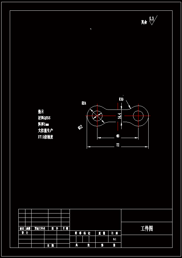垫片具有直线和圆弧构成的简单外形,上面有四个圆孔。外形依靠落料完成,冲孔依靠冲孔工序来完成。通过这个模具的设计。cad软件绘图