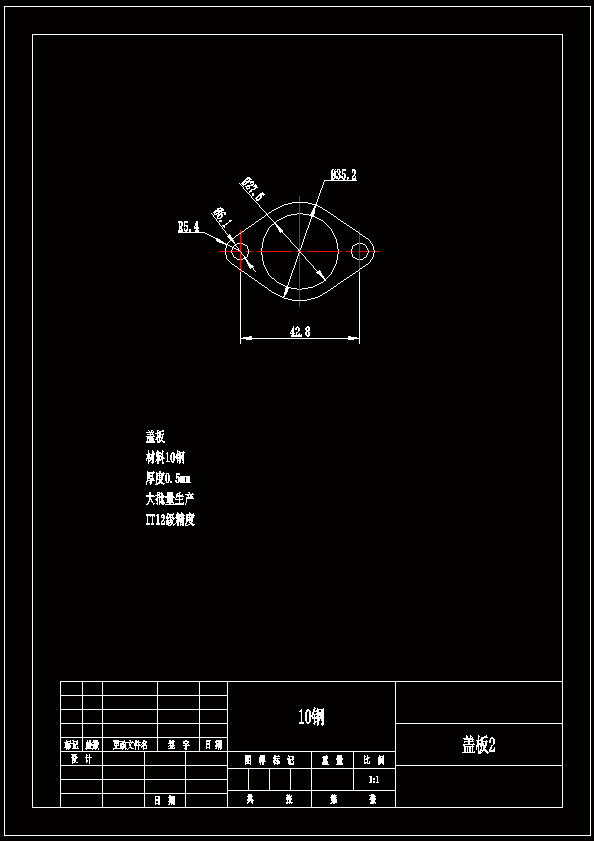 盖板零件冲压级进模具设计 本制件选用材料10钢。盖板总体上下左右对称,厚度为0.5mm, 盖板上有3个圆孔,三个长形孔环形排列。盖板上的最小圆直径为6.4mm。所以盖板可以采用较简单的级进冲裁模。复合冲裁模采用落料冲孔同时加工,级进冲裁模加工的精度较高且盖板要求无翘曲无扭曲。所以选择级进模。本文从凹模开始设计,选择模架,设计凸模,再算其他模具零件尺寸。