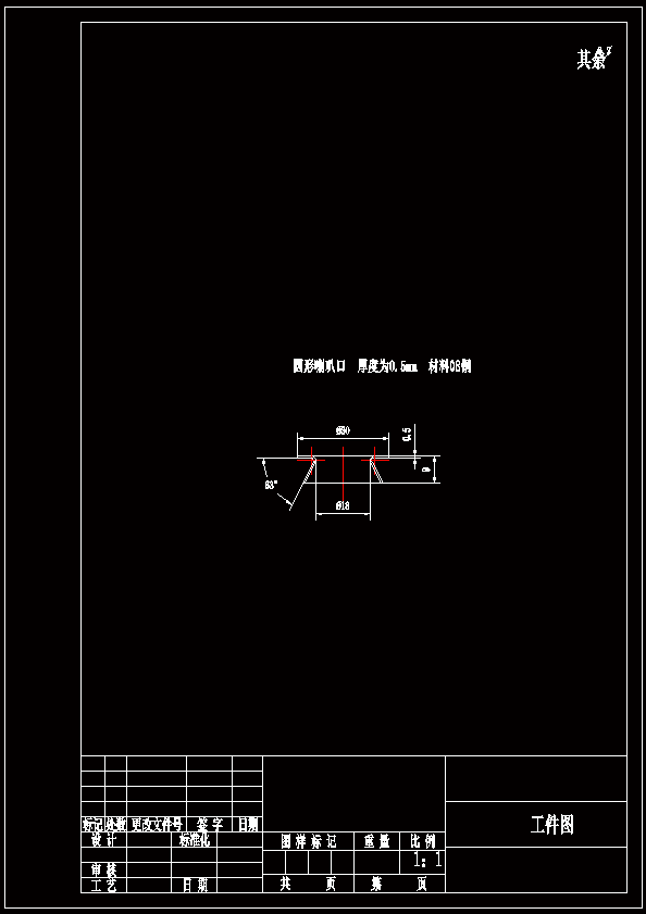所示为一个圆形喇叭口零件,材料为碳钢08,厚度为0.5mm。该零件有一处两次拉深成形,一处冲孔圆形边处90°翻边成形和一处外扩口工艺的扩口成形。此工件形状比较复杂,所需工序较多,工艺比较复杂。