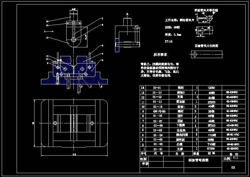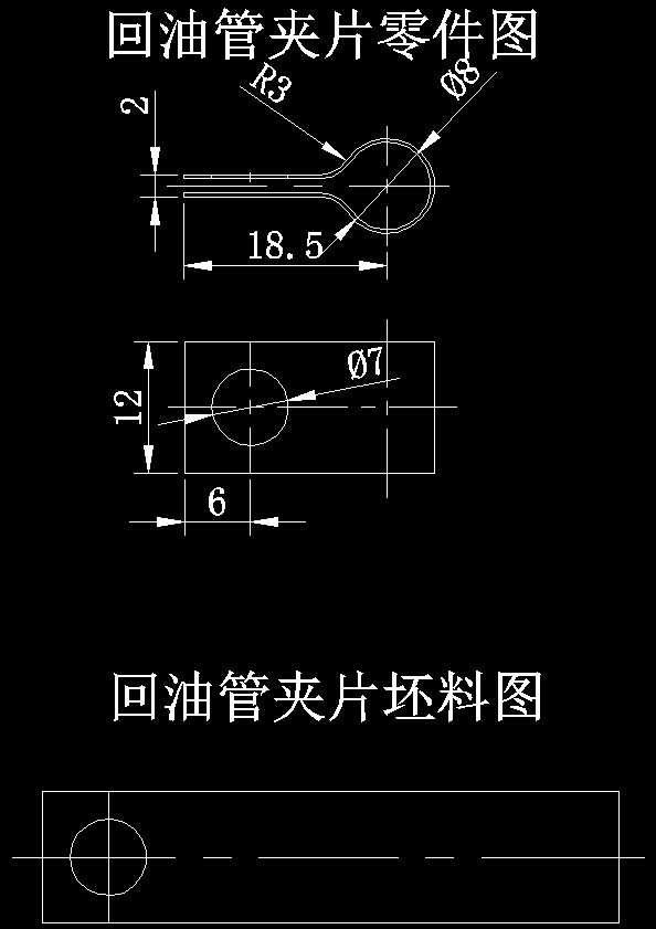 工件为回油管夹片,材料08钢,料厚0.35mm。其工艺性分析内容如下: 1.材料分析 08钢为优质碳素结构钢,具有良好的弯曲成形性能。 2.结构分析 零件结构简单,左右对称,对弯曲成形较为有利。可查得此材料所允许的最 弯曲半径Rmin=0.5t =1.5mm ,而零件弯曲半径 r=2mm>1.5mm ,故不会弯裂。另外,零 件上的孔位于弯曲变形区之外,所以弯曲时孔不会变形,可以先冲孔后弯曲。计算零件 相对弯 曲半径 r / t =0.67 <5 ,卸载后弯曲件圆角半径的变化可以不予考虑,而弯曲 中心角发生 了变化,采用校正弯曲来控制角度回弹。 3.精度分析 零件上只有 1 个尺寸有公差要求,由公差表查得其公差要求属于 IT14,其余未注公 差尺寸 也均按 IT14 选取,所以普通弯曲和冲裁即可满足零件的精度要求。 4.结论:由以上分析可知,该零件冲压工艺性良好,可以冲裁和弯曲。