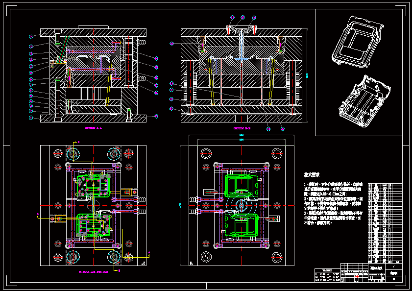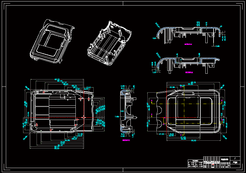 照相机外壳注塑模具设计 根据塑料制品的要求,了解塑件的用途,分析塑件的工艺性、尺寸精度等技术要求,选择塑件制件尺寸。本模具采用一模二件,侧浇口进料,注射机采用海天80XB型号,设置冷却系统,CAD和PROE绘制二维总装图和零件图,选择模具合理的加工方法。