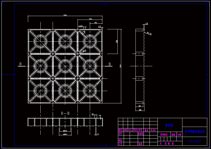 草坪塑料网格砖注塑模具设计 注塑模具是现在所有塑料模具中使用最广的模具,能够成型高精度的复杂塑料制品。本课题是对草坪塑料网格砖模具设计及型腔仿真加工。 考虑到该产品大批量生产,故设计的模具要有较高的注塑效率,浇注系统要能自动脱模,可采用点浇口自动脱模结构。由于该塑件较大且为网格状,所以模具采用一模一腔结构,浇口形式采用点浇口,并采用四点进料,以利于充满型腔。为了使动、定模能够准确地动作,导向定位机构利用导柱与导套的配合。考虑到零件的位置关系,冷却水道采用循环式分布,以便冷却均匀、快速。
