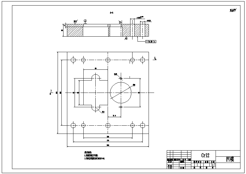 钛合金水泵连接垫圈垫片单排级进模具设计 水泵连接垫圈具有直线和圆弧构成的简单外形,上面有一个大圆孔和2个小圆孔。外形依靠落料完成,冲孔依靠冲孔工序来完成。模具刃口计算后,就是模具的结构设计,先进行凹模外形尺寸的计算的通过凹模的外形尺寸来得到模具中其他固定板、卸料板等的尺寸,最后选择模架等一系列标准件,最终完成模具的设计。