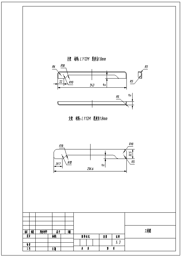 支架零件复合模具设计 本设计是对支架的落料、翻边复合模的设计,完成的内容为:对模具在工业生产中的作用,模具发展历史与现状,未来模具的发展前景做了概述。进行零件的形状、尺寸、精度工艺分析,确定合理的工艺方案,确定工序数目。确定毛坯尺寸,判断能否一次拉成,合理排样,绘制排样图,计算冲裁力、推件力、顶件力、卸料力、翻边力,确定压力中心。确定翻边凸、凹模间隙,计算落料、翻边、冲孔的凸、凹模刃口尺寸。确定凸、凹模结构,并绘制零件图,设计定位零件,压料、卸料、出件零部件,设计固定零件,选择模架标注紧固件。最后绘制模具非标准零件图,用CAD画出二维装配图。