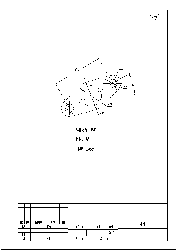 中心距60斜垫片冲压正装复合模设计 零件图的技术要求中,未注公差等级按IT14。又因该冲件结构简单、基本对称、尺寸不大。从零件的形状、尺寸标注及生产批量等分析均符合冲裁的工艺要求。