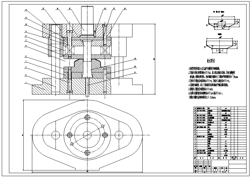 罩盖冲压模具设计【落料拉深冲孔、翻边】 通过对制件的材料,结构,尺寸精度分析。本制件选用材料H62。罩盖总体上下左右对称,厚度为1mm, 罩盖为阶梯圆筒拉伸。罩盖上的最小圆直径为Φ21mm。复合冲裁模采用落料拉深冲孔同时加工,冲裁模加工的精度较高且罩盖要求无翘曲无扭曲。