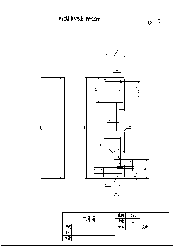 转角安装座冲裁弯曲级进模设计 通过分析我们发现,转角安装座是一个落料冲孔弯曲相结合的弯曲件,上面有多个个圆孔孔和矩形孔。外形依靠落料完成,冲孔依靠冲孔工序来完成,还有1次弯曲工序。通过级进模一次设计模具的设计。