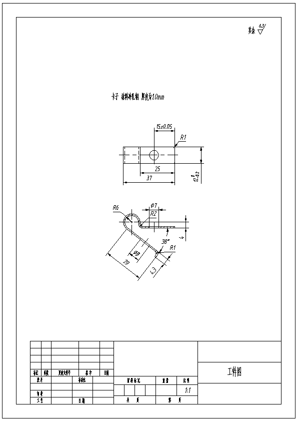 卡子零件冲压复合模和弯曲模设计 通过对制件的材料,结构,尺寸精度分析。本制件选用材料冷轧钢。卡子总体外形简单,厚度为1.0mm, 卡子有两个圆孔,直径分别为7mm和8mm,上边有向内弯曲。有多处弯曲,弯曲最小半径为R1mm。所以卡子可以采用较简单的复合冲裁模和弯曲模。复合冲裁模采用落料冲孔同时加工,复合冲裁模加工的精度较高且卡子要求无翘曲无扭曲。所以选择倒装落料冲孔复合模。