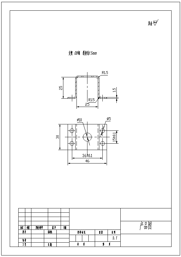 托支架的冲压级进模设计 通过工件的工艺分析,以及各个生产方案的对比,决定采用级进模完成工件的生产。 ,不但可以满足实际生产的需要,同时可以实现大批量生产。初步确定工件的生产工序为:侧刃定距冲孔、切边、弯曲、弯曲、切断。中间可以根据实际情况增加空工位。