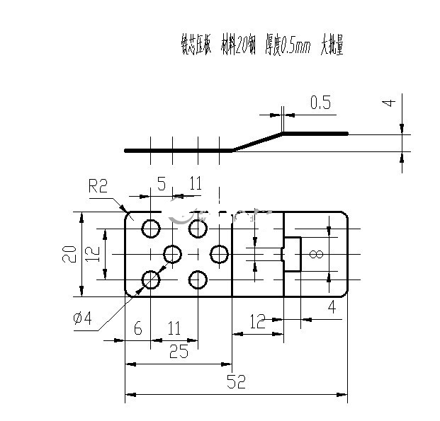 铁芯压板冲压级进模设计 使用级进模的方案最好,不但可以满足实际生产的需要,同时可以实现大批量生产。初步确定工件的生产工序为:侧刃定距冲孔、切边、弯曲、弯曲、切断。中间可以根据实际情况增加空工位。