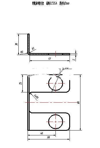 连接支架零件落料冲孔复合模+弯曲模设计 对驾驶座连接支架进行冲压工艺分析和模具设计,通过对制件的材料,结构,尺寸精度分析。本制件选用材料Q235A。驾驶座连接支架总体上下对称,厚度为2mm, 驾驶座连接支架为L形弯曲,右端带有缺口,上面设有2个圆孔,所以驾驶座连接支架可以采用较简单的冲裁和弯曲成形模。最好能采用多工序同时加工本次设计驾驶座连接支架的结构为U形弯曲,两端的弯曲出有缺口,适合一般的冲裁需求。