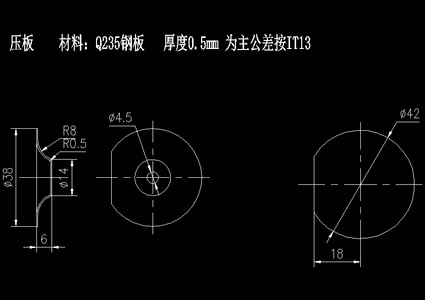 压板零件落料拉伸复合模具设计 压板的结构相对比较简化,外形为直线和曲线结合,主要有落料工序、冲孔工序以及拉伸工序组成。通过综合的分析,需要一个复合模和一个单工序冲孔模来完成。本次只做落料拉深工序复合模。一副模具。