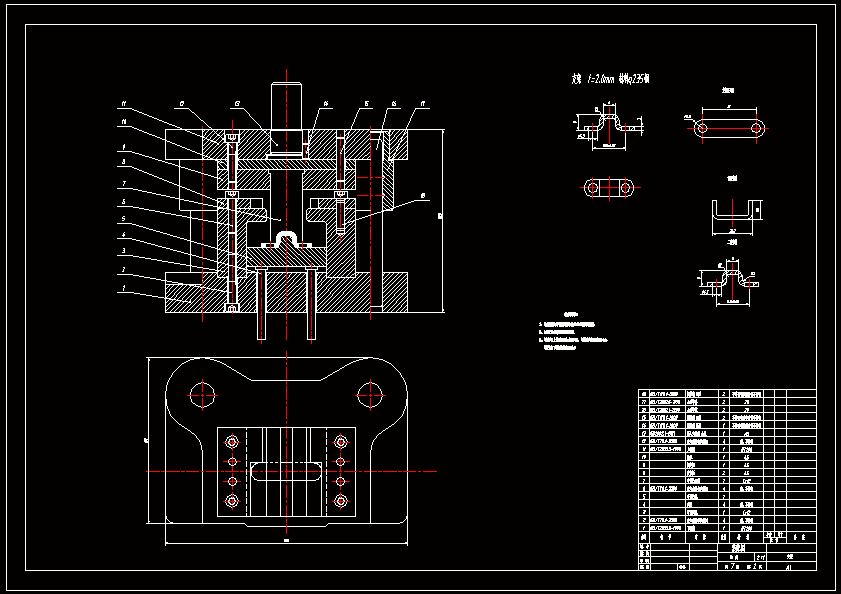 支架工件的单工序弯曲冲压模具设计 从零件图分析,该冲压件采用2mm的Q235钢板冲压而成,可保证足够的刚度与强度。零件外形尺寸注有公差要求,可以弯曲成型。 从零件尺寸标注可以看出模具精度为普通,形状简单,而且尺寸要求相对较高,主要分析其弯曲成型问题,由于中批量生产,采用冲裁模和弯曲生产,本次设计中主要只设计弯曲模。