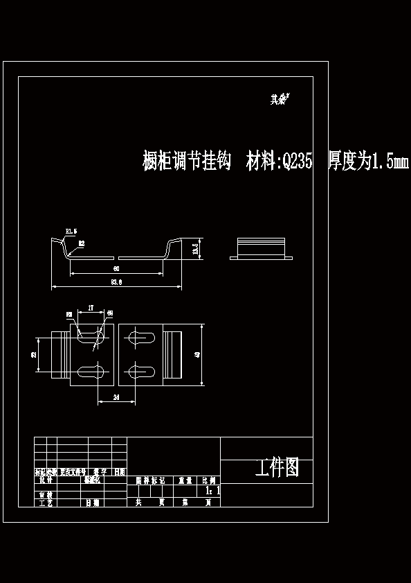 橱柜调节托钩冲压级进模设计 要对壁柜调节挂钩弯曲件的结构性、材料进行分析,选择合适的方式进行生产。材料的分析来确定工件是否适合生产。之后要通过工件的厚度来确定工件排样图的搭边,然后计算排样图的材料利用率。 接下来就是进行冲压力的计算,通过计算冲压力选择合适的冲压设备。模具刃口的计算也有其的重要,只有选择合适的刃口才能够确保模具的寿命,提高模具的使用率。 模具刃口计算后,就是模具的结构设计,先进行凹模外形尺寸的计算的通过凹模的外形尺寸来得到模具中其他固定板 卸料板等的尺寸,最后选择模架等一系列标准件,最终完成模具的设计。