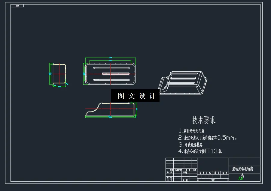 柴油发动机油底壳级进模设计 冲裁件及其技术要求 名称:柴油发动机油底壳 材料:镀锌钢板 料厚:1mm 批量:大批量 采用有废料的排样方法初步设计采用双排直排方案