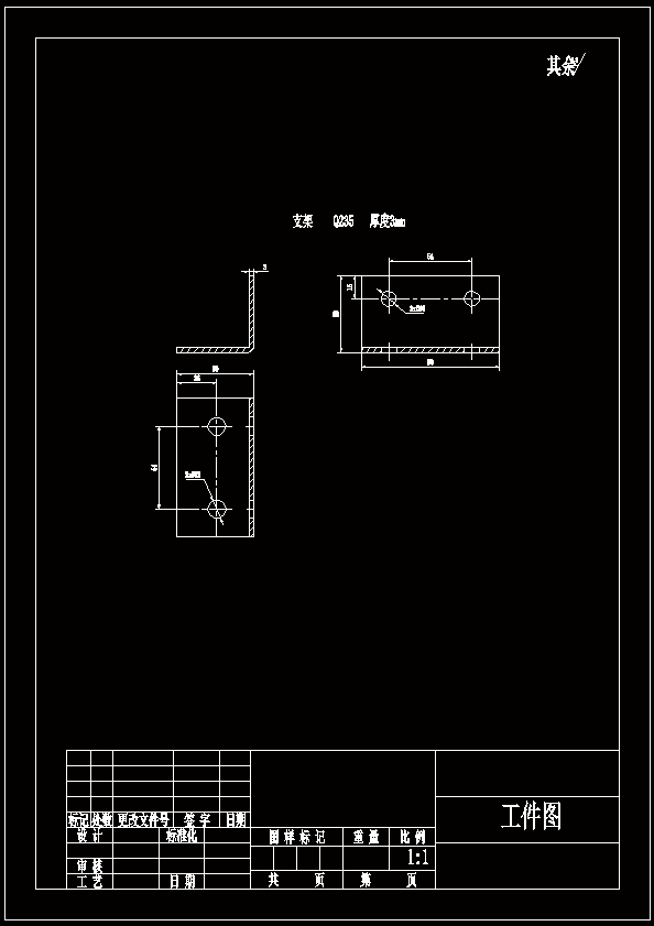 转向油罐支架落料冲孔复合模和弯曲模具设计 工件图支架外形简单对称,材料为Q235,厚度为3mm,未注公差为IT14。冲压模具(简称模具)上的金属板冲压得到的满足要求的产品。模具的设计应便于工件材料的选择,更要注意工件的生产方便、可靠,保证工件质量。