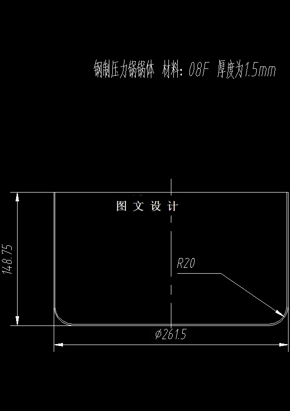 压力锅锅体冲压模具设计 该零件结构较简单、形状对称,属于圆筒形拉深件。零件尺寸公差为IT14,利用普通冲裁方法可以达到零件图样要求。工件不能一次拉深成形。此次绘图是一次拉深图纸。