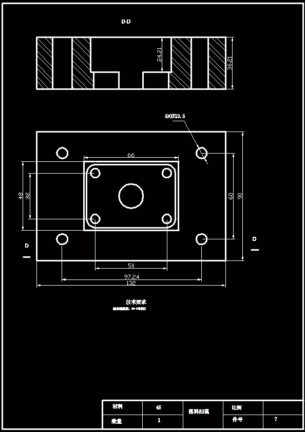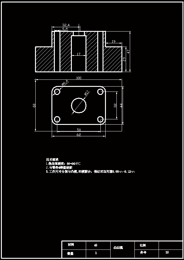 该零件的¢17mm的孔与外缘之间的最小距离为22mm大于此零件要求的最小壁厚,故可以采用冲孔,落料复合模或 冲孔,落料级进模。复合膜模具的形位精度和尺寸精度容易保证,且生产率高,尽管模具结构比较复杂,但由于零件的几何形状比较简单对称模具制造并不困难。级进模虽然生产率也高,但零件的冲裁精度稍差,要想保证冲压件的行为精度,需要在模具上设置导正销导正,故模具制造,安装较复合模复杂。通过对上述三种方案的比较分析,该零件的冲压生产采用方案三的复合模为佳。