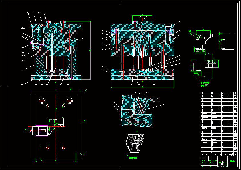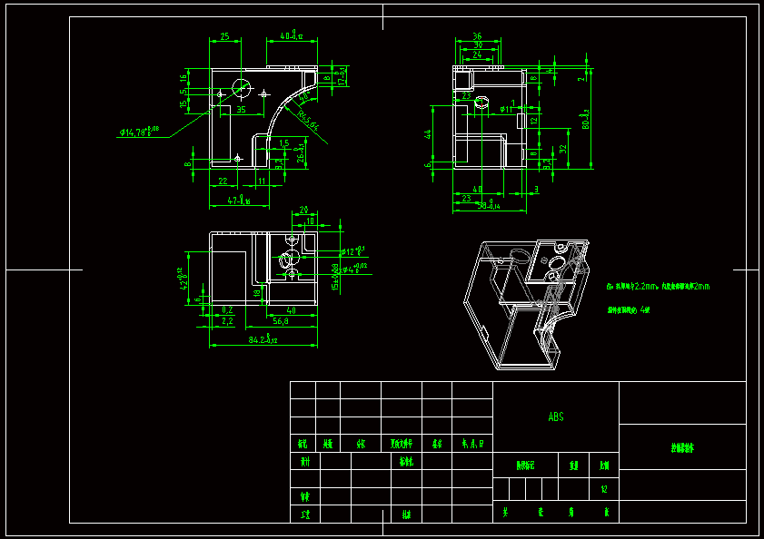 控制器箱体注塑工艺分析及模具设计 根据塑件结构特点,模具采用双分型面注塑模,一模一腔,利用弹簧导柱机构先抽出侧型芯,然后,利用弯销延时机构将侧滑块1抽出,最后,顶杆顶出塑件,能够满足实际中大批量生产,有较高的生产效率。