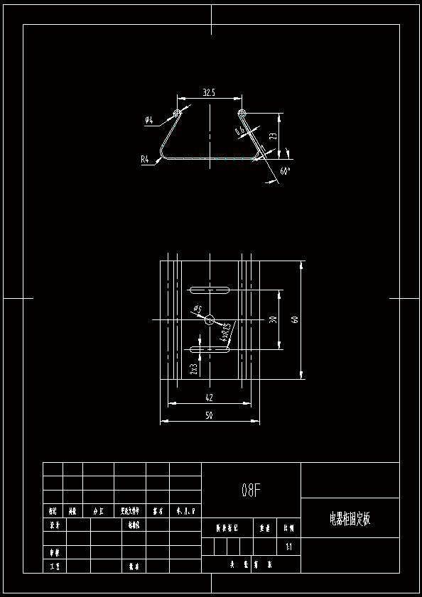 电器柜固定板工艺分析及模具设计含三幅模具 本次设计了冲裁和弯曲的模具。经过查阅资料,首先要对零件进行工艺分析,经过工艺分析和对比,采用冲孔落料弯曲工序,通过冲裁力、顶件力、卸料力、弯曲力等计算,确定压力机的型号。再分析对冲压件加工的模具适用类型选择所需设计的模具。得出将设计的模具类型后将模具的各工作零部件设计过程表达出来。