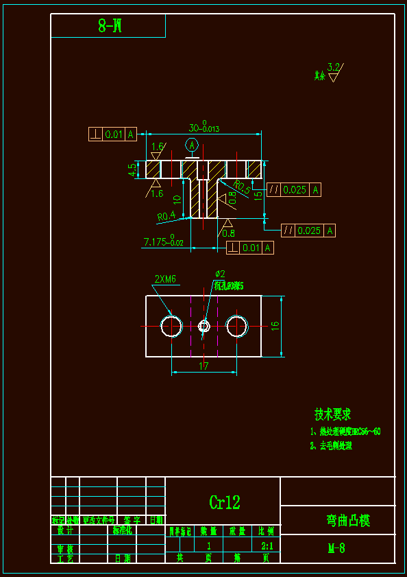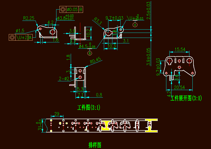 支座零件冲压模具设计介绍了支座弯曲件冷冲压成形过程,经过对支座的批量生产、零件质量、零件结构以及使用要求的分析、研究,按照不降低使用性能为前提,将其确定为冲压件,用冲压方法完成零件的加工,且简要分析了坯料形状、尺寸,排样方案,冲压工序性质、数目和顺序的确定,进行了工艺力、压力中心、模具工作部分尺寸及公差的计算,并设计出模具。