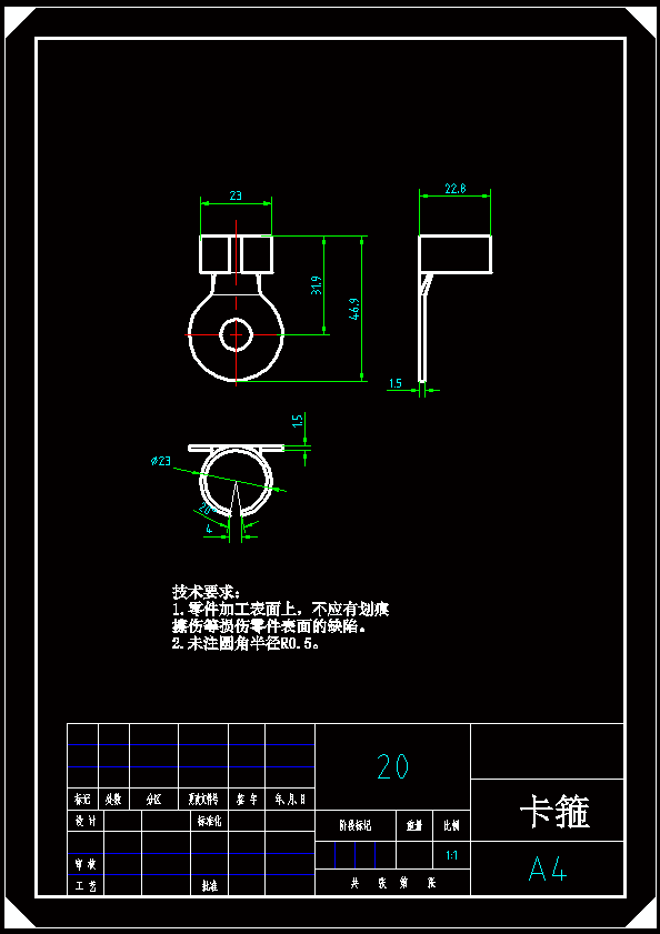 卡箍落料弯曲复合模具设计首先,对零件做整体的分析。包括:材料的使用、精度的要求、工序的要求以及成本的要求等。为了降低成本,对排样方式进行了合理的设计;其次,对零件整体进行工艺设计。通过工艺目的的设计、工序的顺序设计、压力机的选择等来实现所要达到的要求;再次,想要保证制件精度的要求,就要考虑模具刃口尺寸的计算。因为刃口是冲制工件的主要工作部分,刃口处的精度就决定了制件的精度,就必须根据公差来进行精确计算。