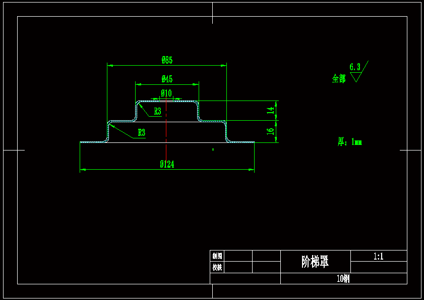 阶梯罩冲压模具设计【冲孔+落料拉深】该零件为带凸缘的阶梯形件,料厚t=1mm,没有厚度不变的要求,零件的形状简单、对称,所有的圆角半径R=r=3mm,满足拉深工艺对形状和圆角半径的要求;所有尺寸均没有特殊的公差要求,所有尺寸为自由公差,设公差等级IT12级,满足拉深工艺对精度等级的要求;零件所用的材料为10,查课本Ⅲ附录7可知 , ,屈强比较小,拉深性能较好,易于拉深成形。 综上所述,该零件的拉深工艺性较好,可用拉深工序加工。