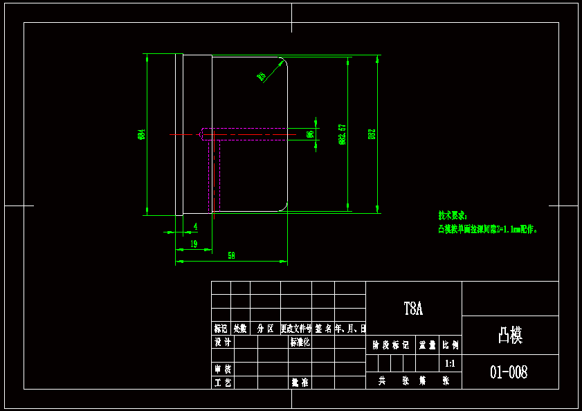 壳体件模具设计【冲压落料拉伸+冲孔】零件的功用与经济性分析: 此件为有缘桶形件,要求内形尺寸,没有厚度不变的要求。该件为对称件外缘弯角处R=3内部底部R=5并且关于中心对称。 该件材料为08号钢,该号钢的硬度适中,塑性和韧性好。其抗拉强度σb=324~441Mpa,在此选择 σb=325Mpa ,具有较好的冲压性能和力学性能,易于进行各类冲裁加工。