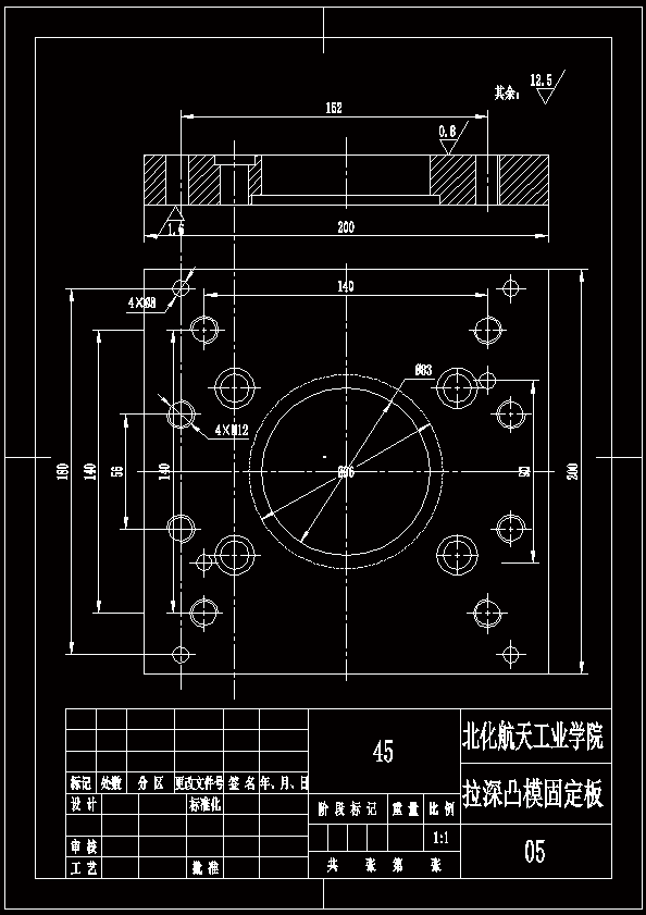 容器盖冲压模具设计与制造此工件名称为容器盖,材料为08A钢,厚度为1.2mm(1)冲裁件的内外转角处为圆角,但其尺寸图中未标注,因此按R=t=1.2mm。 (2)此件的整体外形为圆筒形状,无窄长的悬臂和凹槽。 (3)冲裁件的孔间距和孔边距分析:最小孔间距为φ3与φ20孔之间的距离b=2.8mm > 2t=2.4mm,最小孔边距为φ20孔到容器盖侧壁距离b=38.8-35=3.8mm > 2t=2.4mm,因此满足冲裁要求。