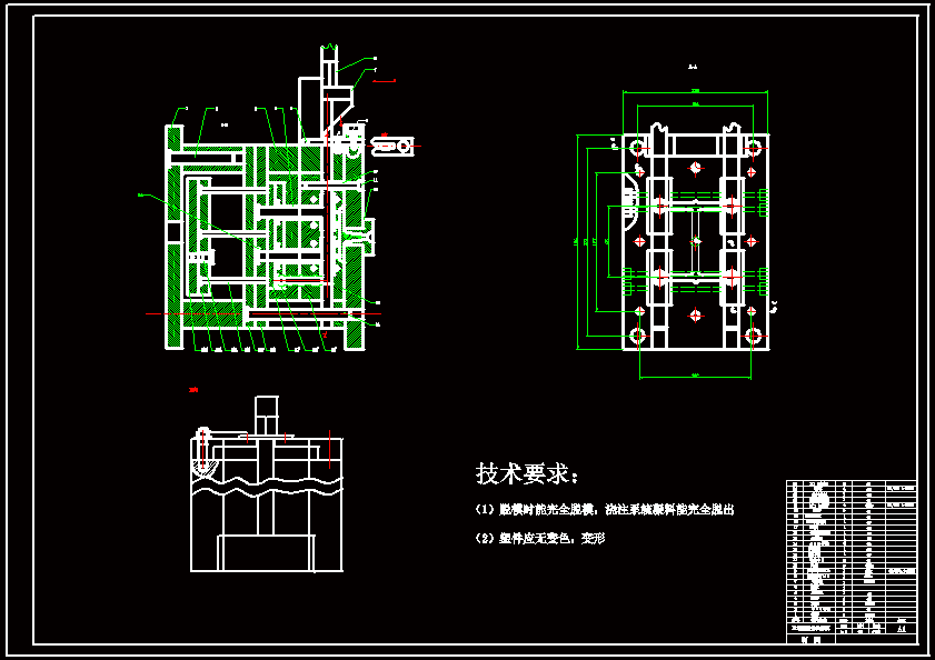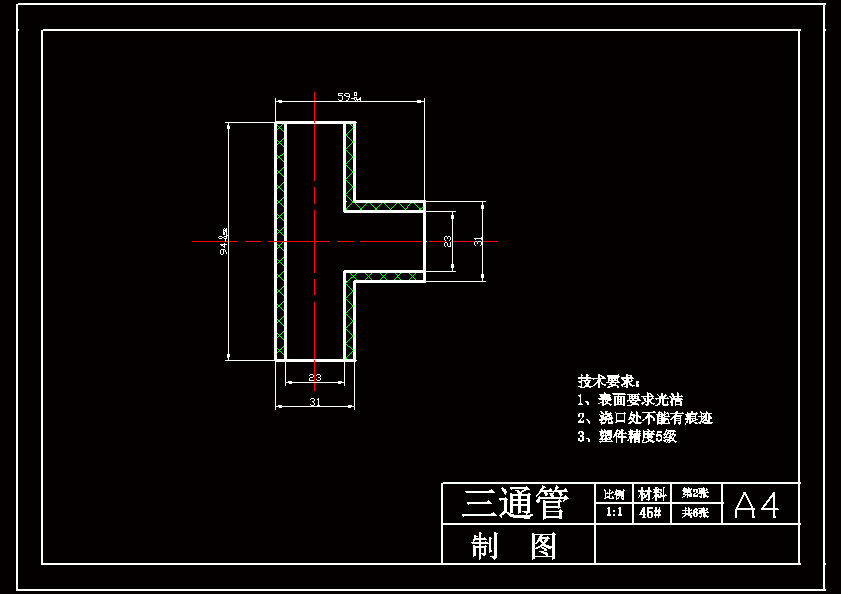 三通管,其结构简单表面粗糙度要求不高。所选材料为ABS,ABS是非结晶聚合物,不透明、无毒、无味及微黄的垫塑性树脂。可燃烧,但燃烧缓慢且有特殊刺激味,密度1.02——1.20g/ cm3。ABS具有三种成分的综合性能丙烯晴使ABS具有一定的强度、硬度、耐化学性、耐油性级耐热性。丁二烯使ABS具有弹性,良好的冲击强度和耐寒性。苯乙烯可使ABS具有优良的介电性能、光泽和良好的成型加工性能。因此,ABS是一种具有坚韧、质硬和刚性的工程塑料。通过控制三种成分的比例可以改变ABS的性能。ABS具有突出的力学性能和良好的综合性,坚固、坚韧、坚硬,是重要的工程塑料,用途广泛。设计的注射模为一出四腔的单分型注射模,即一次成型四只塑件,具有生产效率高、质量好,原材料利用率高等特点。由于本塑件结构简单,浇注系统凝料修整方便,故采用单分型面注射模。