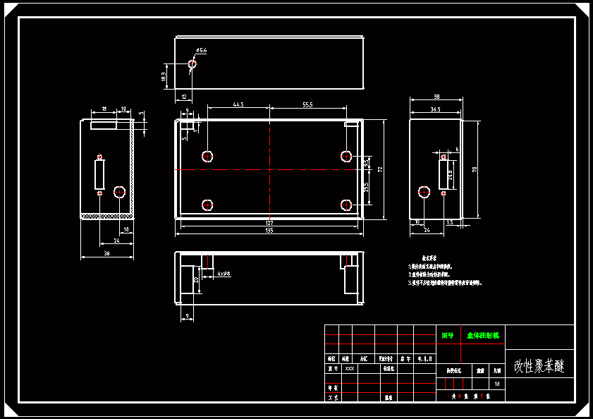 盒体注射模设计【含9张CAD图纸】本设计为盒体注塑模的设计,设计分型面选在截面最大处,浇口采用点浇口,塑件成型后利用推杆将成型制品从动模上推出。 设计中需要对塑件的尺寸进行计算,确定尺寸精度,然后进行注射机的选取。对注射机参数进行校核,包括模具闭合厚度、模具安装尺寸、模具开模行程、注射机的锁模力等。各个参数都满足要求后才能确定注射机的型号。