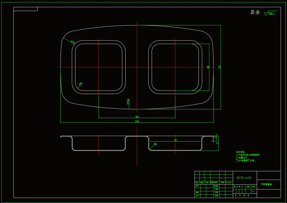 不锈钢餐盘模具设计 模具设计与冲压工艺应该从零件的质量、、生产的成本、效率,劳动的强度、环境的保护以及生产的安全性等各个方面综合考虑。选择生产效率高的、生产成本较低的、生产安全的工艺方案和模具。