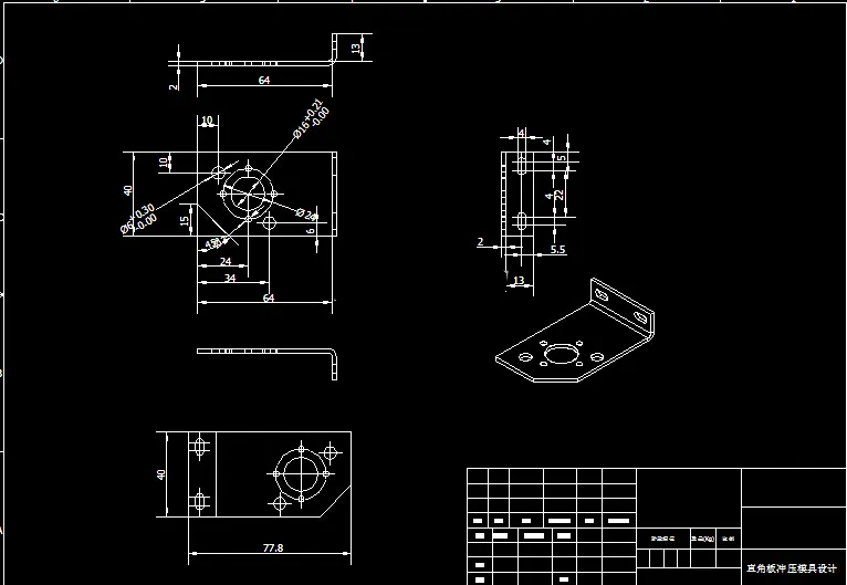 不锈钢弯曲件冲压模设计-直角板冲压模具设计 本文主要介绍了模具在现代工业中应用情况以及它的发展现状,发展方向。本设计以给定的零件来选择合理的模具,通过几种不同的模具比较最终定位采用复合模,工艺过程分为落料、冲孔、 弯曲成形,根据工艺要求确定了排样图,从而设计了凸凹模,确定各种力,确定模架查找标准件。最后一生产厂家和用户的角度对产品进行了技术经济分析。