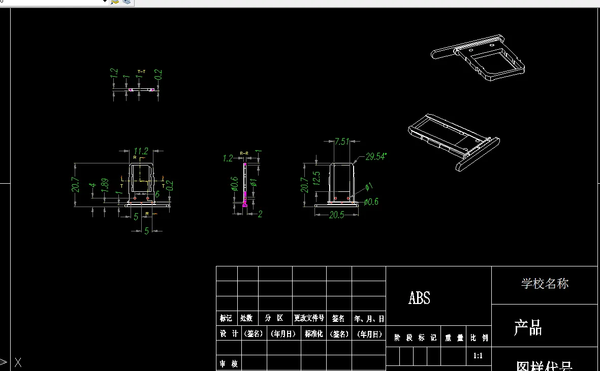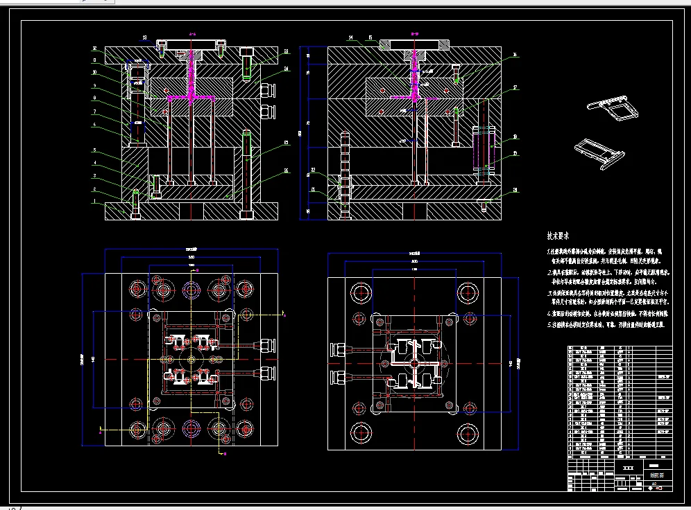 本篇的产品设计说明书阐述的是一块关于手机卡卡槽注塑模具的设计,由于机械手机卡卡槽注塑产量大,塑胶塑胶制件相对简单制作成本较低,因此适合使用塑胶模具进行大规模生产制造,为此设计出适合机械手机卡卡槽注塑生产制造的塑胶模具,关于塑胶制件的外观与结构做出分析,该产品的外观尺寸属于小型塑胶制件,产品结构相对简单尚无复杂的弧度与外观,对于最基本的产品分析确定塑胶制件的方案,经过分析后,该塑胶使用一模四腔的加工工艺进行生产与制造,并且设计机械手机卡卡槽注塑完整的塑胶模具示意图,参考机械塑胶模具的参数以及设计相关塑胶制件的尺寸,完成机械塑胶模具示意图和模具零件的装配图。