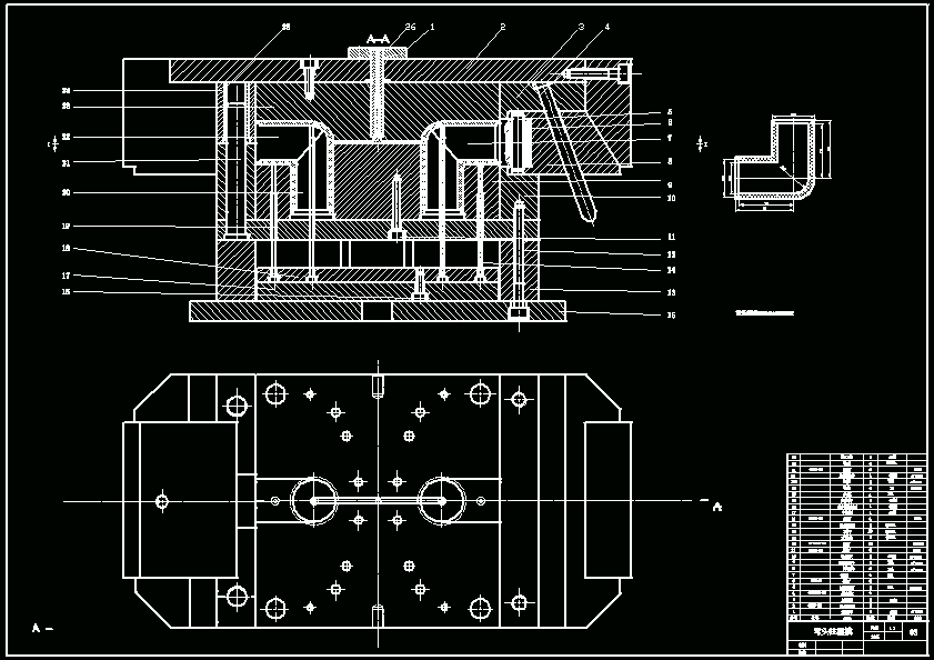 弯头塑料模设计 本套模具采用侧浇口,设计时考虑选择从塑件的表面进料,而且在模具结构上采取镶拼型腔﹑型心,有利于填充﹑排气,故采用截面为矩形的侧浇口;根据计算,因为模具每分钟所需的冷却水体积流量很小,故可不设冷却系统,依靠空冷的方式即可。 本塑件为侧向抽芯注塑模,由于侧孔比较大,增大的抽芯难度,所以增大了模具的重量。由于抽芯较困难,采用推管抽芯。从控制制件尺寸精度出发,对弯头注塑模的各主要尺寸进行了理论计算,以确定各工作零件的尺寸,从模具设计到零部件的加工工艺以及装配工艺等进行详细的阐述。