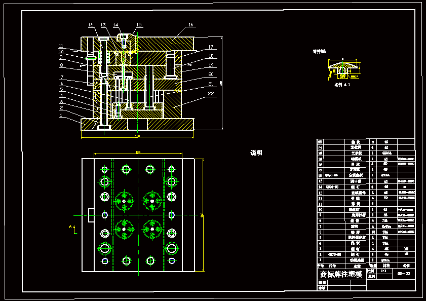 商标牌注塑模设计 本设计运用塑料成型工艺及模具设计的基础知识,首先分析了塑件的成分及性能要求,为选取浇口的类型做好了准备;然后估算了塑件的体积,便于选取注塑机及确定型腔数目;最后分析了塑件的特征,确定模具的设计参数,设计要点,及推出装置的选取。 本塑件的材料采用聚乙烯,属热塑性塑料。型腔采用镶拼式结构,用顶管推出,复位杆复位。由于商标牌的上部分要求严格,所以采用点浇口浇注系统,脱模后不在修正浇口的痕迹。但采用这种浇口时,常常要在模具上增加一个分型面,以便浇口凝料脱模。