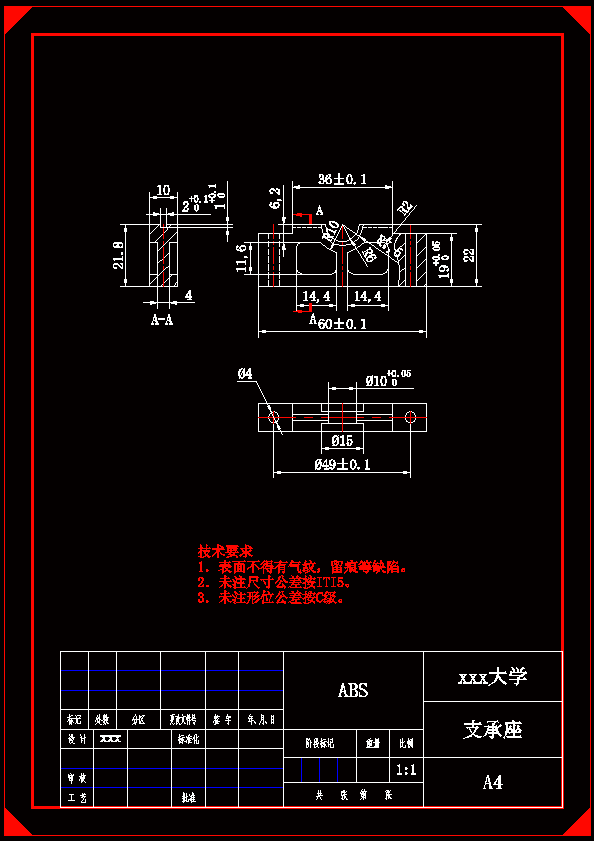 本次是为了让我们能综合运用机械制造工艺学中的基本理论, 并结合生产实习中学到的实践知识,独立的分析和解决工艺问题,具备设计一个中等复杂程度零件的工艺规程的能力和注塑模设计的基本原理和放法,拟定模具设计方案,完成模具结构设计的能力,也能熟悉和运用有关手册、图表等技术资料及编写技术文件等基本技能的一次实践。该课题从产品结构工艺性,具体模具结构出发,对模具的浇注系统、模具成型部分的结构、顶出系统、冷却系统、注塑机的选择及有关参数的校核、都有详细的设计。通过整个设计过程表明该模具能够达到此塑件所要求的加工工艺。也就是设计一副注塑模具来生产支承座产品,以实现自动化提高产量。针对支承座的具体结构,该模具是侧浇口的单分型面注射模具。通过模具设计表明该模具能达到制件质量和加工工艺要求。