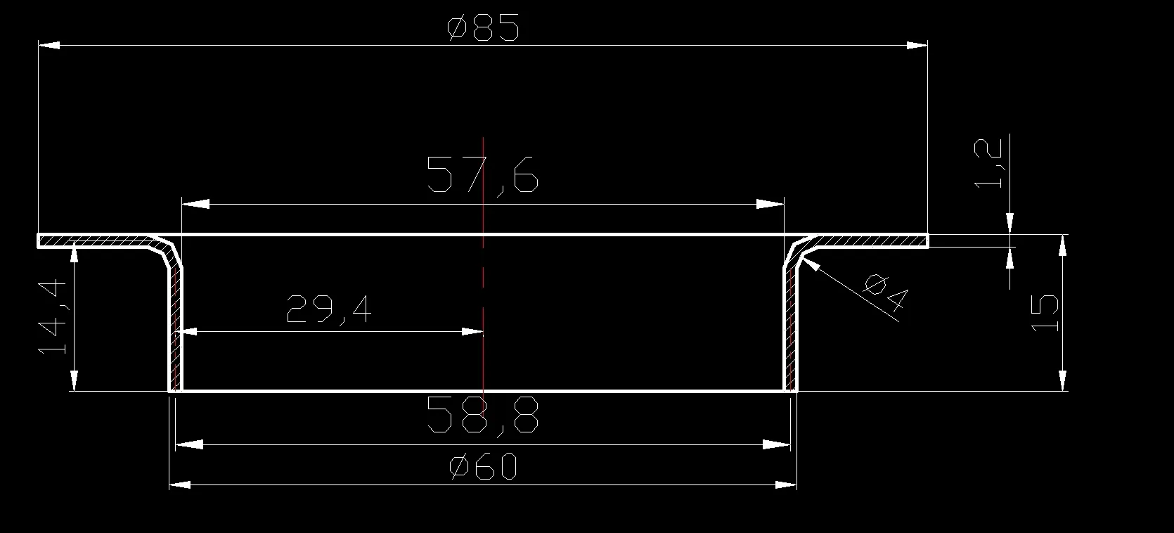 此设计为衬套翻边冲压模具设计(17169),采用材料:08钢,厚度:1.2mm.,提供二维装配图1张及主要零件图4张+设计报告文档( 文档约0.5W字 24页)。此衬套是一个圆筒的复合零件件,内孔为圆孔翻边,最小处为1.2mm均满足最小壁厚要求。此为无变薄翻边零件。其中最大尺寸为85mm,属于中小型零件。最小尺寸为15mm,不小于冲孔的最小半径(1.0t=1.2),所以衬套尺寸设计合理,满足工艺要求。