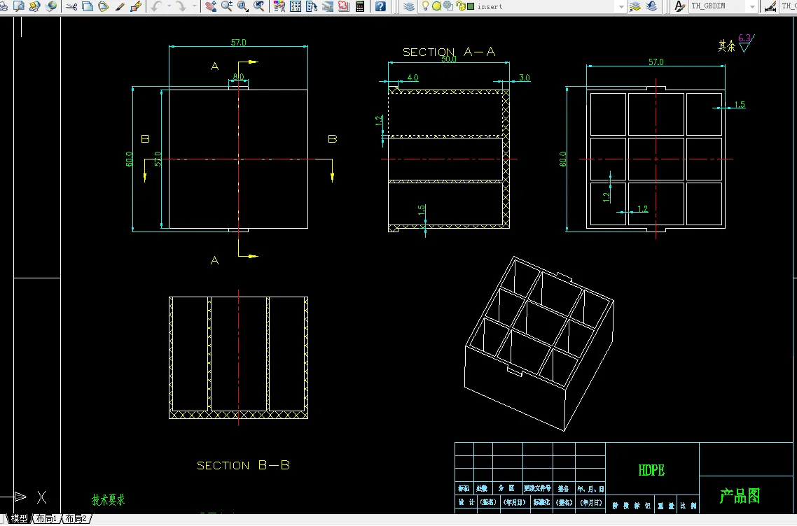 塑料是一种可塑性的合成高分子材料,具有重量轻且坚固,耐化学腐蚀, 电绝缘性好,价格便宜,可塑性好等特点,广泛应用于电脑、手机、汽车、电机、 电器、家电和通讯产品制造中。 注射成形是成形塑件的主要方法之一, 是指使用注射机将热塑性塑料熔体在 高压下注入到模具内经冷却固化获得产品的方法。注射的优点是生产速度快,效 率高,操作可自动化,能成型形状复杂的零件,特别适合大量生产。 本次课程设计的产品为塑料盒,具有重量轻,强度高,耐腐蚀,易清洁等 特点,为大批量生产产品。本次设计在针对产品进行工艺性分析后,确定模具分 型面、 型腔数目、 浇口形式、 位置大小; 其中最重要的是确定型芯和型腔的结构, 以及它们的定位和紧固方式。此外还进行了脱模机构的设计,合模导向机构的设 计,冷却系统的设计等。最后绘制完整的模具装配总图和主要的模具零件图及编 制成型零部件的制造加工工艺过程卡片。实践证明:该模具结构合理、可靠,并 能保证产品质量,对此类注射产品的模具设计有参考价值。