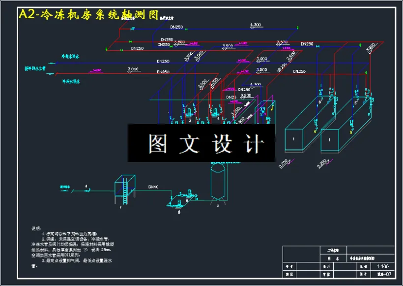 本设内空调系统设计。在设计中,进行夏季冷负荷和冬季热负荷的计算。决定采计是某体育中心空调系统设计,主要任务是完成冷冻站和室用电制冷中央空调系统加城市热网的方案,根据各不同功能空间(特别注意有大空间),如游泳馆、健身房等,设计不同的空调末端:如风机盘管加独立新风、一次回风等系统。空调主机螺杆式制冷机组:LWWS-1200,制冷(热)量为438KW两台。夏季:2台螺杆式制冷机组全部开启运行,供给空调系统7/12℃的冷冻水,冷量由冷却塔提供;冬季由市政热网通过板式换热器供给空调系统和普通散热器采暖系55/45℃的热水,热量由市政热网提供,不同季节运行工况的转换靠阀门的切换实现。在冷负荷计算的基础上完成主机和风机盘管的选型,并通过风量、水量的计算确定风管路和水管路的规格,并校核最不利环路的阻力和压头用以确定新风机和水泵。依据相关的空调设计手册所提供的参数,进一步完成新风机组、水泵、制冷机组等的选型,从而将其反应在图纸上,最终完成整个空调系统设计。