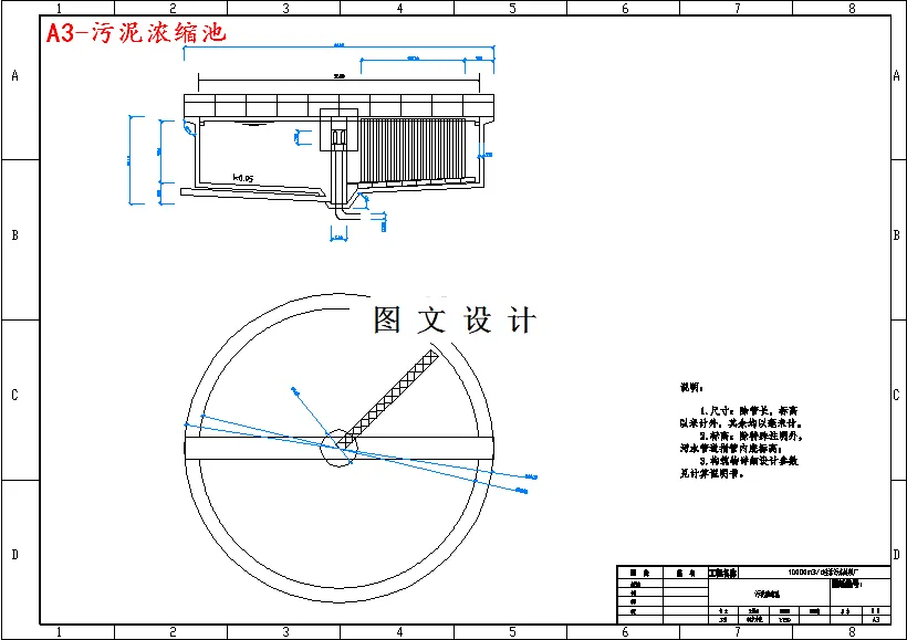 本设计为 10000m3/d 每天污水处理厂工艺设计,通过查阅资料,工艺选择, 构筑物设计计算,平面、高程以及单体图的绘制,使我对城市污水处理厂的设计 计算过程有了较为深入的认识和理解,达到了设计训练的目的。 本设计包括以下内容: CAD 图纸 5 张:平面布置图 1 张 高程布置图 1 张 SBR 反应池单体图 1 张 接触氧化池单体图 1 张 浓缩池单体图 1 张 SBR 是一种间歇式的活性泥泥系统,其基本特征是在一个反应池内完成污 水的生化反应、固液分离、排水、排泥。可通过双池或多池组合运行实现连续进 出水。SBR 通过对反应池曝气量和溶解氧的控制而实现不同的处理目标,具有 很大的灵活性。SBR 池通常每个周期运行 4-6 小时,当出现雨水高峰流量时,SBR 系统就从正常循环自动切换至雨水运行模式,通过调整其循环周期,以适应来水 量的变化。SBR 系统通常能够承受 3-5 倍旱流量的冲击负荷。