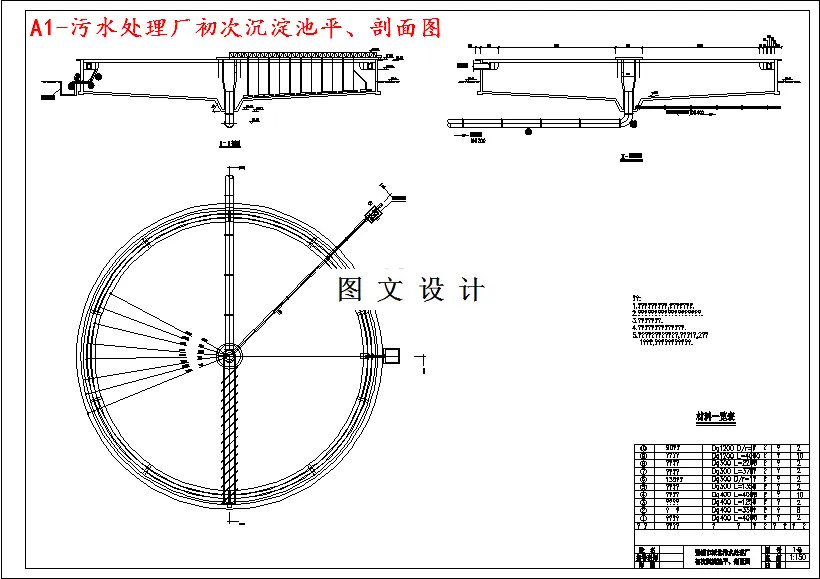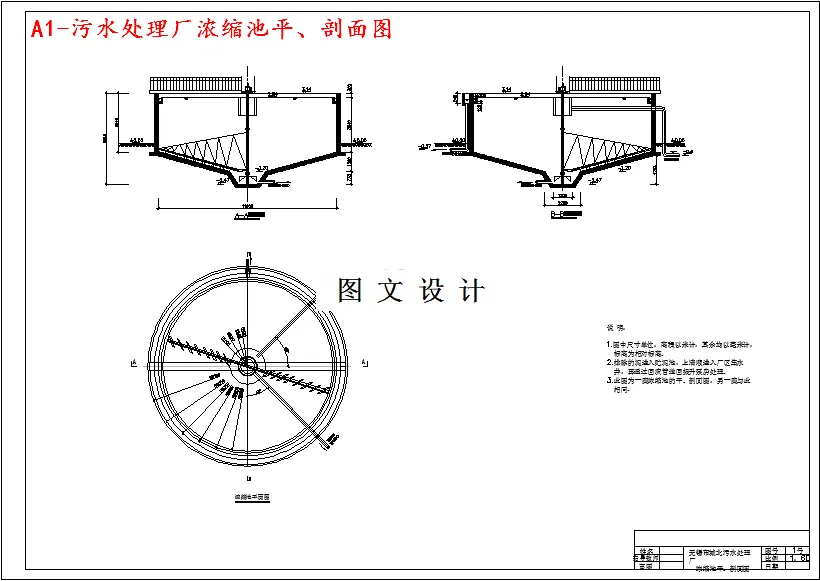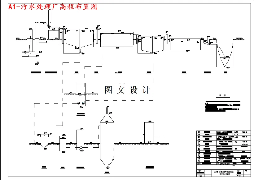 本设计污水厂污水量为11万吨,采用职工人数为52人。管理人员及干部13人站30%,工人39人占70%。设计内容与要求:污水及污泥处理工艺方案比较和处理构筑物的选型;污水处理工程水处理构筑物的设计计算;污水处理工程污泥处理构筑物的设计计算;污水处理和污泥处理高程的计算;污水处理厂的工程概算。(1)污水处理厂工艺及污水回用总平面布置图1张,包括处理构筑物、附属构筑物、配水、集水构筑物、污水污泥管渠、回流管渠、放空管、超越管渠、空气管路、厂内给水、污水管线、中水管线、道路、绿化、图例、构筑物一览表、说明等;(2)污水处理厂污水和污泥及污水回用工程高程图布置1张,即污水、污泥处理高程纵剖面图,包括构筑物标高、水面标高、地面标高、构筑物名称等;(3)污水总泵站或中途泵站工艺施工图1张;(4)污水处理及污泥处理工艺中单项构筑物施工平面图和剖面及部分大样图5张;(5)污水回用工程中主要单位构筑物的工艺施工图1~2张;