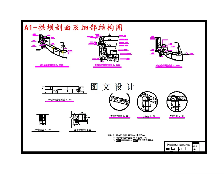 A江水利枢纽同时兼有防洪、发电、灌溉、渔业等综合作用,水库正常蓄水位184.5m,设计洪水位187.35m,校核洪水位189.96m,汛前限制水位182.0m,死水位164m,尾水位103.5m.水库总库容12.27亿m3。A江水利枢纽工程等级为一等,工程规模为大(1)型工程,主要建筑物等级为1级,次要建筑物等级为3级,临时建筑物等级为4级。A江水利枢纽的主要组成建筑物有挡水建筑物、主副厂房、泄水建筑物、过木伐道等。挡水建筑物为一变半径变中心角的双曲拱坝,坝高100m,坝顶宽8.5m,坝底厚25.5m。泄水建筑物由两个浅孔和两个中孔组成:浅孔位于两岸,孔口宽8.5m,高8m,进口底高程164m,出口底高程154m;中孔位于水电站进口两侧,孔口宽7.5m,高7m,进口底高程135m,出口底高程130m。在坝身泄水孔的上下游侧分别布置检修闸门和工作闸门,检修闸门采用平板门,工作闸门采用弧形闸门,在每个工作闸门上有一个启闭机房,浅孔启闭机房高程为176m,中孔启闭闸门高程为150m。泄槽支撑结构采用框架式结构。坎顶高程119m,浅孔反弧段半径为40m,中孔反弧段半径为50m。泄槽直线段的坡度与泄槽底部坡度一致,挑射角θ=200,导墙厚度为1m,浅孔导墙高度7m,中孔导墙高度8m。坝后式厂房装有4台5万千瓦的机组,主厂房长81m,宽18m,副厂房宽66m,宽10m,装配厂长21m,宽18m。压力管道直径为4.6m,进水口底高程为157m。发电机层高层114.8m,尾水管底高程90.8m。为防止坝基渗漏,在坝基靠近上游侧进行帷幕灌浆,并且为了减小坝基处的扬压力,在帷幕后设置排水孔。为了防止混凝土产生裂缝,拱坝坝体设置横缝,横缝面上需设键槽,以咬合加固,增强坝体的抗剪能力。当底宽在40~50m以上的拱坝,才考虑设纵缝,而本设计中,坝顶厚25.5m,小于40m,所以可不设纵缝