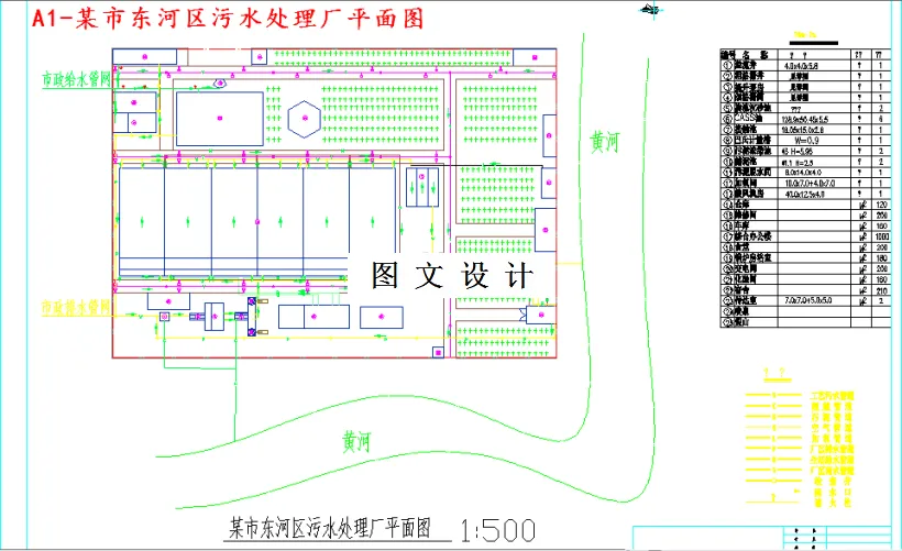 本设计题目为“某集团公司废水处理工艺设计”,该工程所处理的污水主要是由染色废水和毛绒组成。经建设方确认,本设计规模按日最大处理水量:1500 m3/d。污水主要污染物CODcr、SS、油、氨氮,色度等,其污水水质如下:染色废水:COD=1980 mg/L SS=184 mg/L氨氮=340.8 mg/L石油类=2.2 mg/L色度=1000 倍。毛绒废水:COD= 8020 mg/L SS=4110 mg/L氨氮=161.2 mg/L石油类=383 mg/L色度=100倍。 年平均气温为12℃,最高39.2℃,最低-22℃,月平均温度低于-15℃的结冻天数15天。年平均降雨量476.9毫米,年平均蒸发量1517.9毫米。年平均风速3.3米/秒,主导风向为西北风;处理站处理水质为:BOD5≦25mg/L,CODcr≦150mg/L,SS≦200mg/l,PH=6-9,色度≤80倍,出水水质符合国家的二级排放标准。 本设计采用水解酸化加生物接触氧化处理废水。处理构筑物主要有调节池、气浮池、水解酸化池、生物接触氧化池、竖流式沉淀池、浓缩池、泵房、脱水机房和鼓风机房等。预处理的调节池和水解酸化池及气浮池有效的降低了污水的各项指标,为生物接触氧化池的进水,提供了最佳进水指标,同时还有效的降低了污水的色度,再加上后面的竖流式沉淀池的絮凝沉淀作用,色度指标大大降低,基本上可以满足出水的要求。