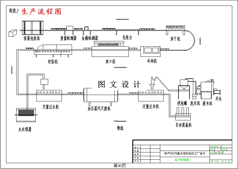 本设计采用无菌方便米饭生产。对大米进行加压蒸汽杀菌,并在无菌的环境中蒸饭水填充以及封口,切边。让大米的蒸制过程无微生物感染,且生产过程无添加剂。具有安全卫生,口感优质,使用方便,货架期长等特点。本设计进行了500万盒方便米饭的工厂设计。包括厂址选择,总平面设计,工艺流程设计,物料衡算,设备选型,生产车间平面设计,水汽用量,辅助部门设计,生活设施,技术经济分析等。
